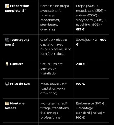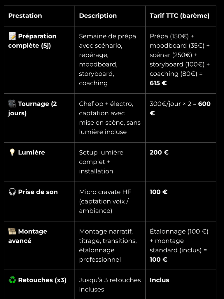 Ce pack est conçu pour celles et ceux qui veulent une vidéo avec un vrai impact visuel et narratif, à mi-chemin entre film d’entrepriseet mini-fiction de marque.